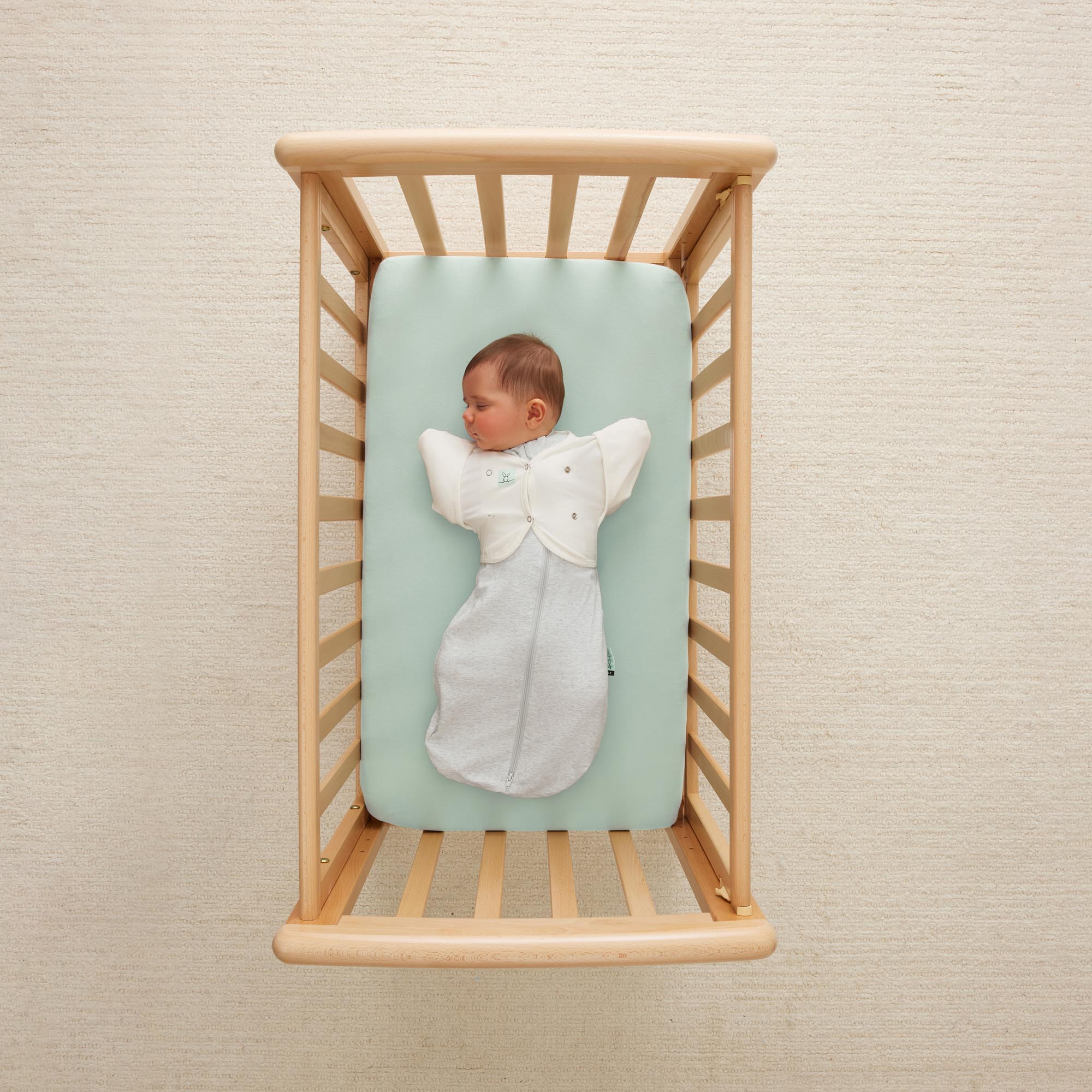 EPBF-0.2T02-06MGR19When your swaddled baby begins to show signs of rolling, it is time to transition them to arms-out sleeping for their safety. The Butterfly Cardi is innovatively designed to be a transition aid worn over your baby’s swaddle or sleeping bag, to help them transition to arms-out with minimal sleep interruptions and maximum sleep comfort. The 0.2 TOG rating makes it a light layer suitable for use over any sleeping bag in any room temperature. The Butterfly Cardi features unique arm pockets to create a sense of containment, the feeling your baby will be used to from swaddling. By gently releasing one arm out of the swaddle at a time and into the pocket, you will be easing your baby to sleep fully arms-out over a period of 10 days, helping them get used to the new sensation as you go. With their arms inside the pocket, your baby will also have access to their hands for self-soothing. For babies who may still have a strong startle reflex, the press studs can be adjusted to make a firmer fit around your baby's torso. Read full How-to-use instructions here. The super stretch in all directions will ensure your baby remains comfortable and allow for full chest expansion when breathing. The position of the Butterfly Cardi on the body will not interrupt the natural sleeping position for healthy hip joint development. Made with our signature premium GOTS certified organic jersey cotton. Natural fibres are better for sleeping for the simple reason they are breathable, and help your little one regulate their temperature overnight. Our certified organic fibres are also skin-friendly and sensitive on eczema and dry skin conditions. All ergoPouch fabrics are dyed with non-toxic water based dyes. Not to be used as an alternative for swaddling.